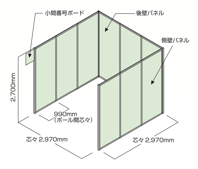 ※認められない小間形状・配置:L字状の小間形状、シングル小間にて3面を通路に接する配置、1社で通路を挟んだ小間配置。